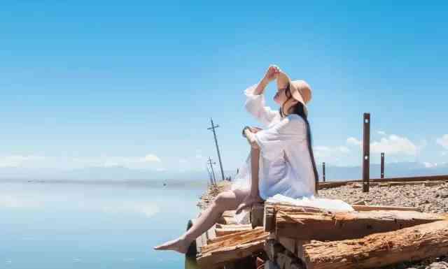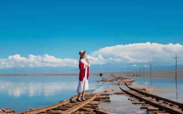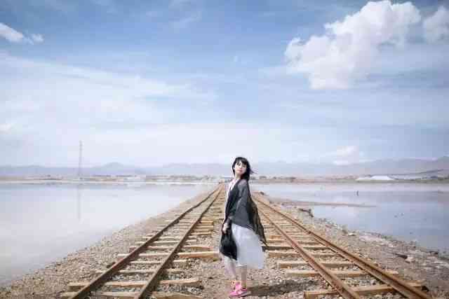 在茶卡盐湖铁轨上摄影,拍摄主体尽量不要看镜头,这种摄影会更加自然。