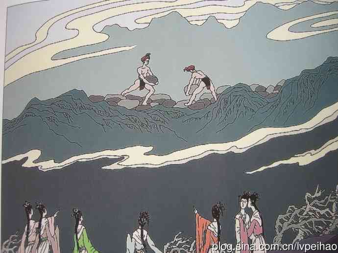 风魔太厉害,吹倒了不少山石。七仙女挺身而出,站在新垒起的石山上,用身体阻挡冷风。