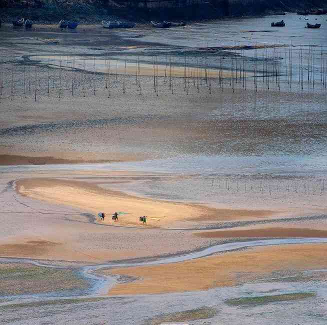 天气不好拍紫菜时,可以用长焦对准因为潮水涨落而形成的浅滩线条,还可以拍当地渔民走在浅滩上更有趣味点,当渔民走在浅滩上的水里时,倒影会呈现出来,能让画面更丰富,所以我们可以运用300mm的长焦拍摄有线条感的沙滩,也可以用500mm的镜头拍摄渔民走在浅滩上的画面,这样注重线条和色彩,就能避免阴天的尴尬了,注意在拍摄带有模特地画面时,要把渔民放在画面的黄金点。