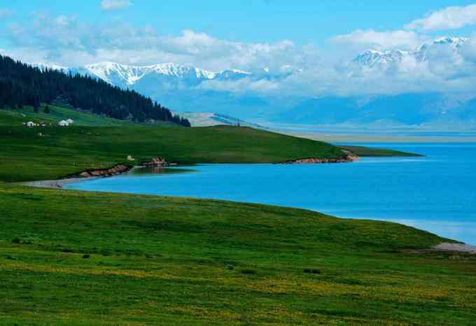 赛里木湖:古称“净海”,位于中国新疆博尔塔拉州博乐市境内的北天山山脉中,紧邻伊犁州霍城县,是一个风光秀美的高山湖泊。以神奇秀丽的自然风光享誉古今中外。赛里木湖湖面海拔2073米,东西长约30公里,南北宽约25公里,周长90公里,水域面积455——460平方公里,呈椭圆形,最大水深92米,蓄水总量210亿立方米,是新疆海拔最高、面积最大的高山冷水湖。