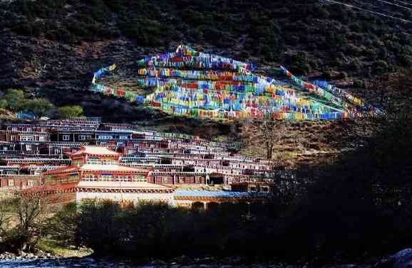 措普寺,背靠扎金甲博神山,面朝措普湖,是一座藏传佛教寺庙,典型的藏式建筑,已有700多年的历史。寺庙内大殿雕刻、壁画工艺精湛,寺庙四周经幡随风飘扬。