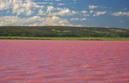 西澳珀斯的赫特泻湖是一个粉红色盐湖,因为湖水咸度大,湖中藻类产生的β-胡萝卜素非常多,所以肉眼看上去湖水呈明亮的粉红色。