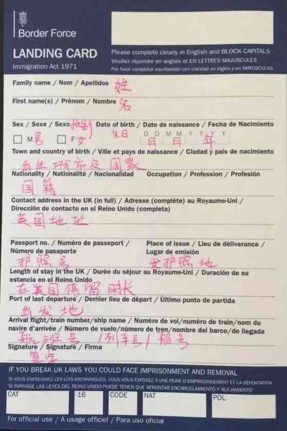 在飞机即将抵达英国时,空中服务人员一般会向您提供英国入境卡和海关申报书,也可在机场入关前柜台处免费领取。填写时请用英文大写字母,中英文对照入境卡请参考以下模版,对于信息不确认的内容请提前与旅行社联系咨询