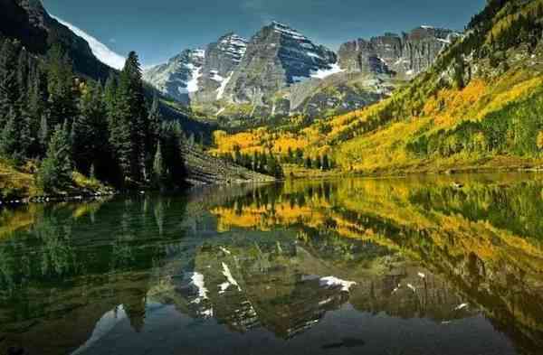 秋季,是颜色最多元的时候,远处的高山已降下白雪,森林里红绿相间的树林像是大地的调色盘,秋季的洛基山,美得更像一幅画。